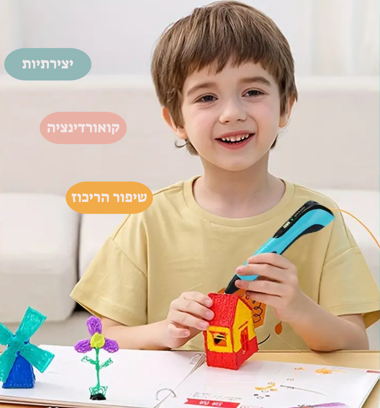 הכלי המושלם לילדים ולמבוגרים להפוך רעיונות למציאות. בעזרת טכנולוגיה מתקדמת של חימום פלסטיק והנחתו בדיוק מרבי, תוכלו "לצייר" באוויר או על משטחים וליצור צורות ודמויות מרהיבות בתלת-ממד.